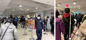 ↑宝くじの購入列に並ぶ社員(右写真の矢印)。この日は一粒万倍日と大安が重なり、長い列ができていたようです。