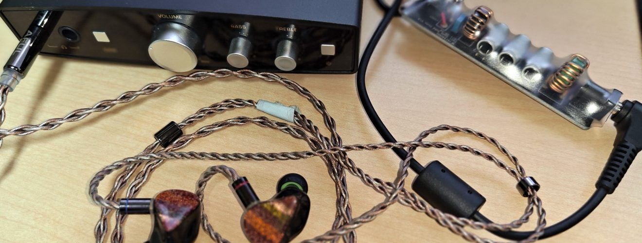 今回紹介するデバイス(下:イヤホン、左上:DAC/AMP、右上:DC電源ノイズクリーナー)